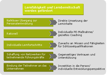 Lernprozesse für vier Schlüsselqualifikationen: Die Lernprozesse werden durch einen bestimmten Ablauf des Lernpotenzial-AC initiiert: Nach einer individuellen Vorbereitung der Teilnehmer zu einer Schlüsselqualifikation erfolgt eine AC-Übung mit einem lernförderlichen Feedback-Prozess. Im Anschluss folgt eine auf die AC-Inhalte abgestimmte Trainingsphase. Danach wird wiederum eine AC-Übung für die Schlüssel- qualifikation durchgeführt, wodurch Veränderungen und Lernfortschritte genau eingeschätzt werden können. Sowohl über einen lernförderlichen Feedback-Prozess als auch über weitere Diagnose-Tools werden Aussagen zur individuellen Lernfähigkeit der Teilnehmer abgeleitet, die dann in weiteren in gezielt für die einzelnen Personen zusammengestellten Personalentwicklungsmaßnahmen münden können. Das Lernpotenzial-AC verbindet somit die Vorteile des klassischen AC (praxisnahe, valide Beurteilung von Kompetenzen) mit den Vorteilen der Lernfähigkeit, die Anpassung an notwendigen Wandel im Unternehmen einzuschätzen. Der Einsatz ist besonders geeignet für Führungs(nachwuchs)kräfte, High-Potentials bzw. Mitarbeiter mit guter Entwicklungsperspektive im Unternehmen. Abb.: Nutzen des Lernpotenzial-AC © 2004 M. Stangel-Meseke und H.